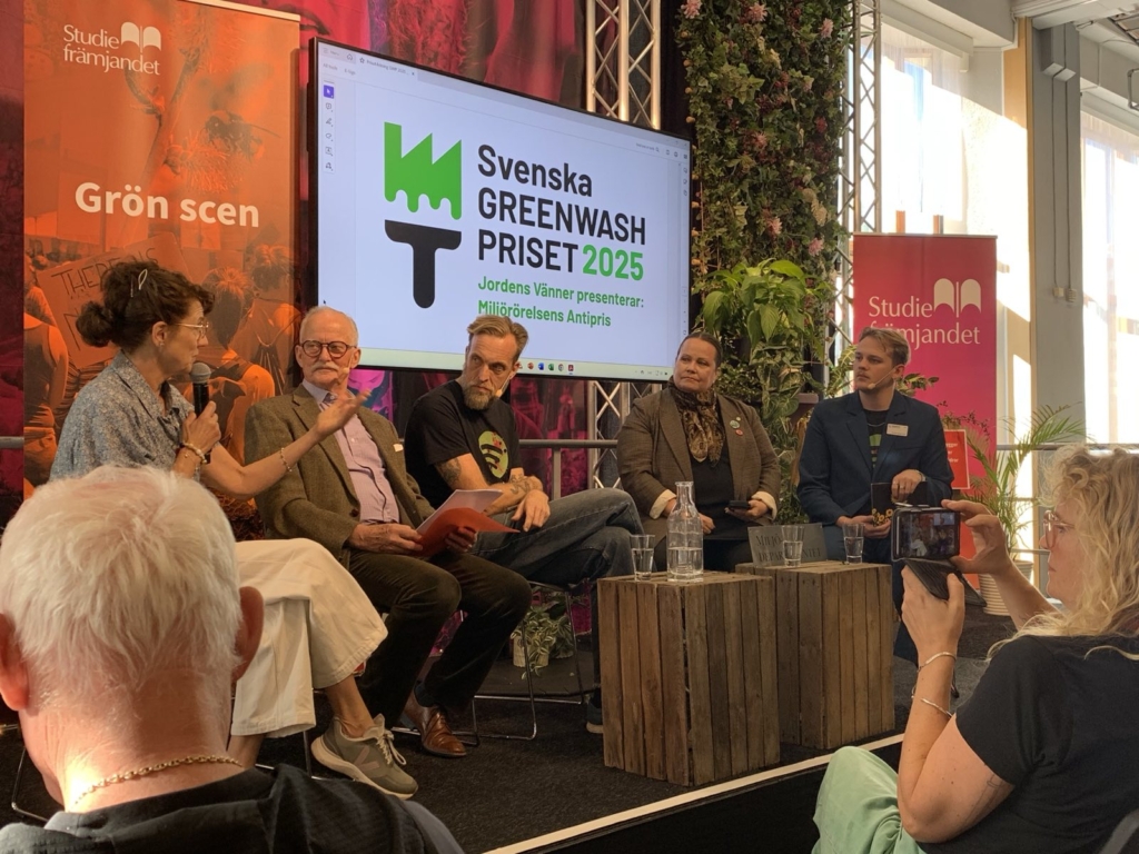 I sexton år har Jordens Vänner delat ut Svenska greenwashpriset. Priset är Jordens Vänners mest uppmärksammade kampanj och får varje år stor medial uppmärksamhet. 2025 var Ikea, Arla och Sca finalister och med en överväldigande majoritet av rösterna tog skogsbolaget SCA hem segern. Prisutdelningen på Grön Scen på Bokmässan var fullsatt och SCA:s vinst väckte debatt och fick stor uppmärksamhet både i miljökretsar och i skogsbranchen.